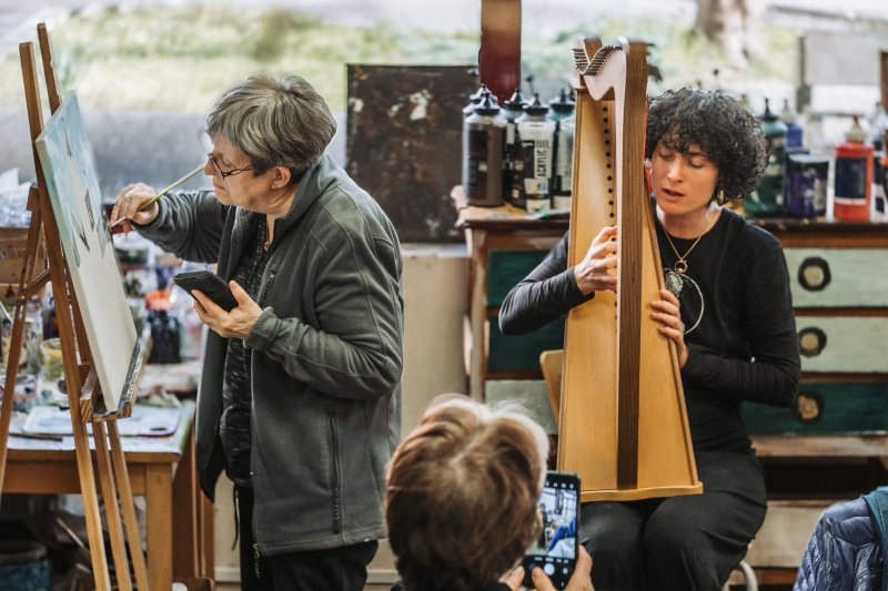 En mars, Fanny est aussi venue à la rencontre des participant·es de l'atelier Passerelle, un espace ouvert à tous·tes, gratuit et sans inscription. Ici, des personnes de tous âges aux parcours de vie parfois difficiles se retrouvent pour peindre. Artiste peintre animateur de l'atelier, Jean-Marc Le Bruman rappelle que « pour ces personnes dont le rapport au corps et aux émotions est parfois blessé, il peut être difficile d'aller à la rencontre de leurs sensations ». Mais Fanny a su les rencontrer : en proposant de petits échauffements comme elle les pratique en tant que chanteuse, puis en déambulant en chantant pour accompagner leur geste artistique. Il s'agissait de voir comment le chant peut faire écho dans l'art plastique. « Cette expérience était nouvelle, déroutante et très positive, se réjouit Jean-Marc. Elle a offert des émotions à des personnes qui ne sont pas dans la consommation de divertissement ; on est vraiment là dans le « prendre soin » grâce à l'art, ce qui donne encore plus de valeur au projet. »