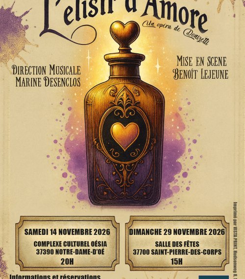Dans un village ensoleillé, un jeune rêveur croit trouver dans un « élixir magique » le courage de conquérir la femme qu'il aime. Entre un sergent trop sûr de lui, une charlatane flamboyante et des sentiments qui se révèlent malgré eux, naît une comédie tendre où l'amour finit par triompher. Un spectacle familial avec des costumes, des décors, du chant... 2 heures pour rire, rêver et s'évader. Venez soutenir nos talentueux solistes et choristes engagés sur ce projet depuis maintenant bientôt deux ans.