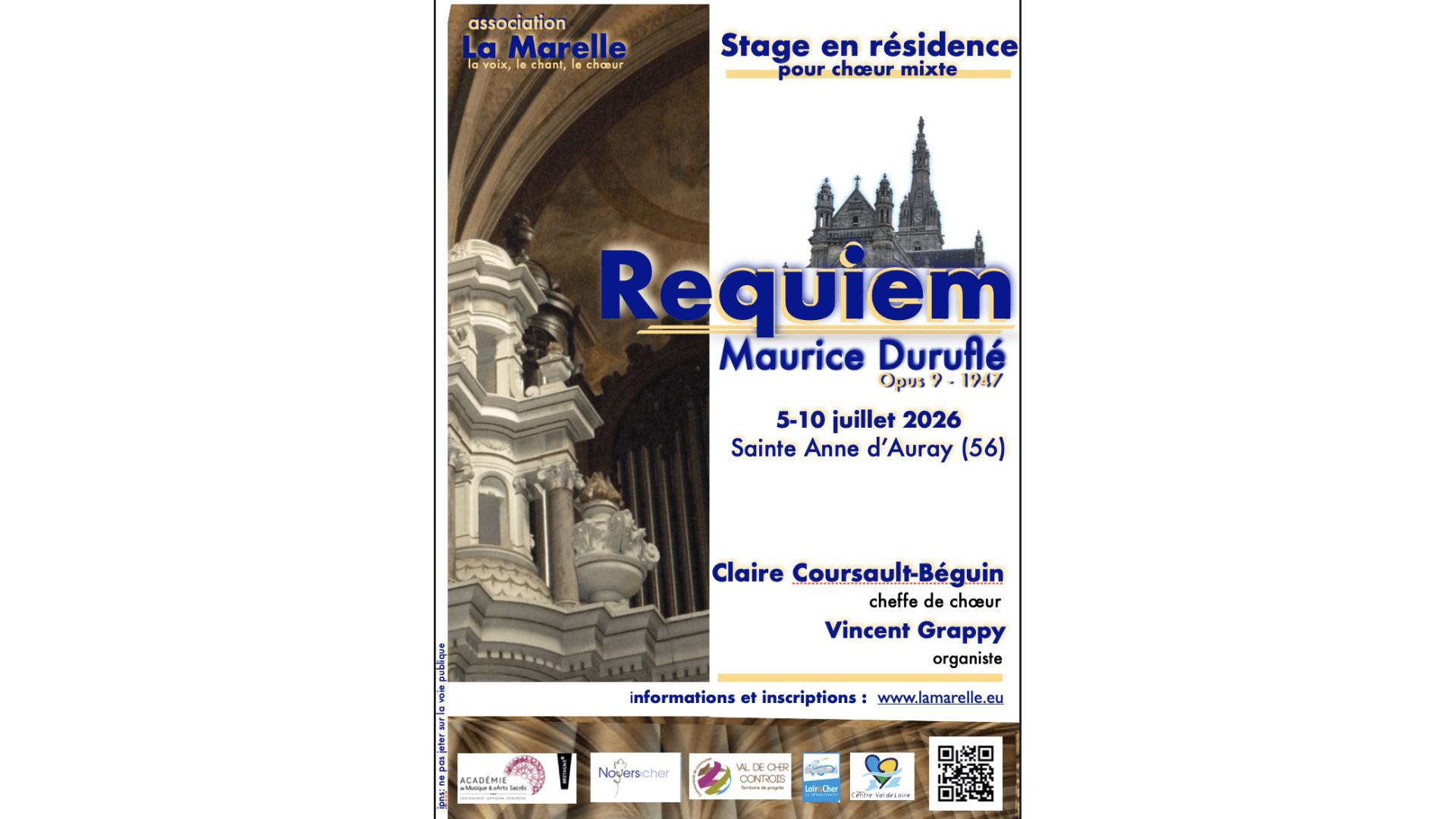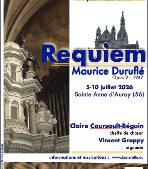 Au programme; le requiem, opus 9, de Maurice Duruflé. Dans un superbe lieu dédié à la musique, les stagiaires, sous la direction de Claire Coursault-Beguin, auront à disposition des salles de travail avec piano et orgue, ainsi que la possibilité d'aller chanter dans la basilique Sainte-Anne-d'Auray, où se trouve un orgue de facture Cavaillé-Coll.